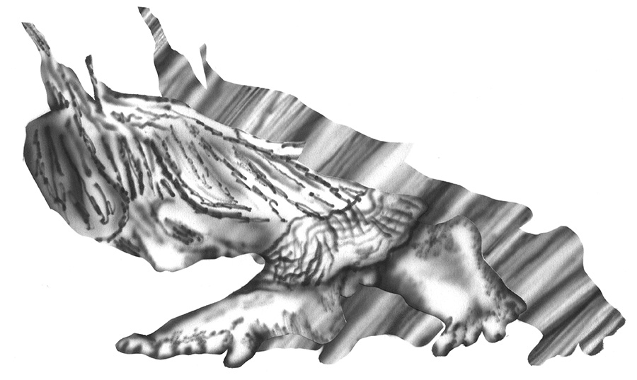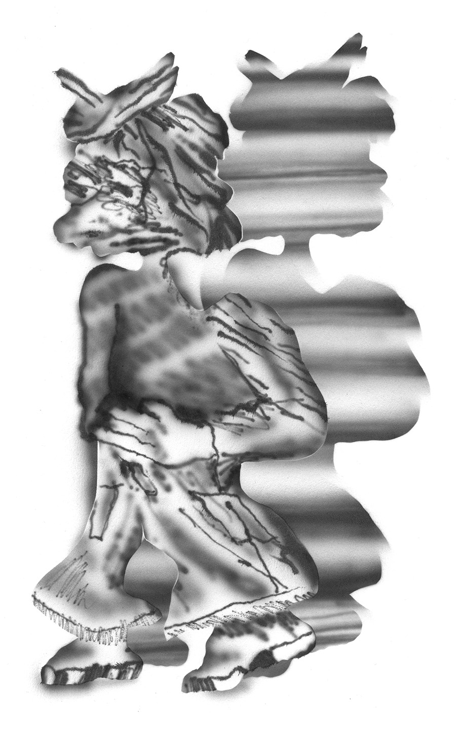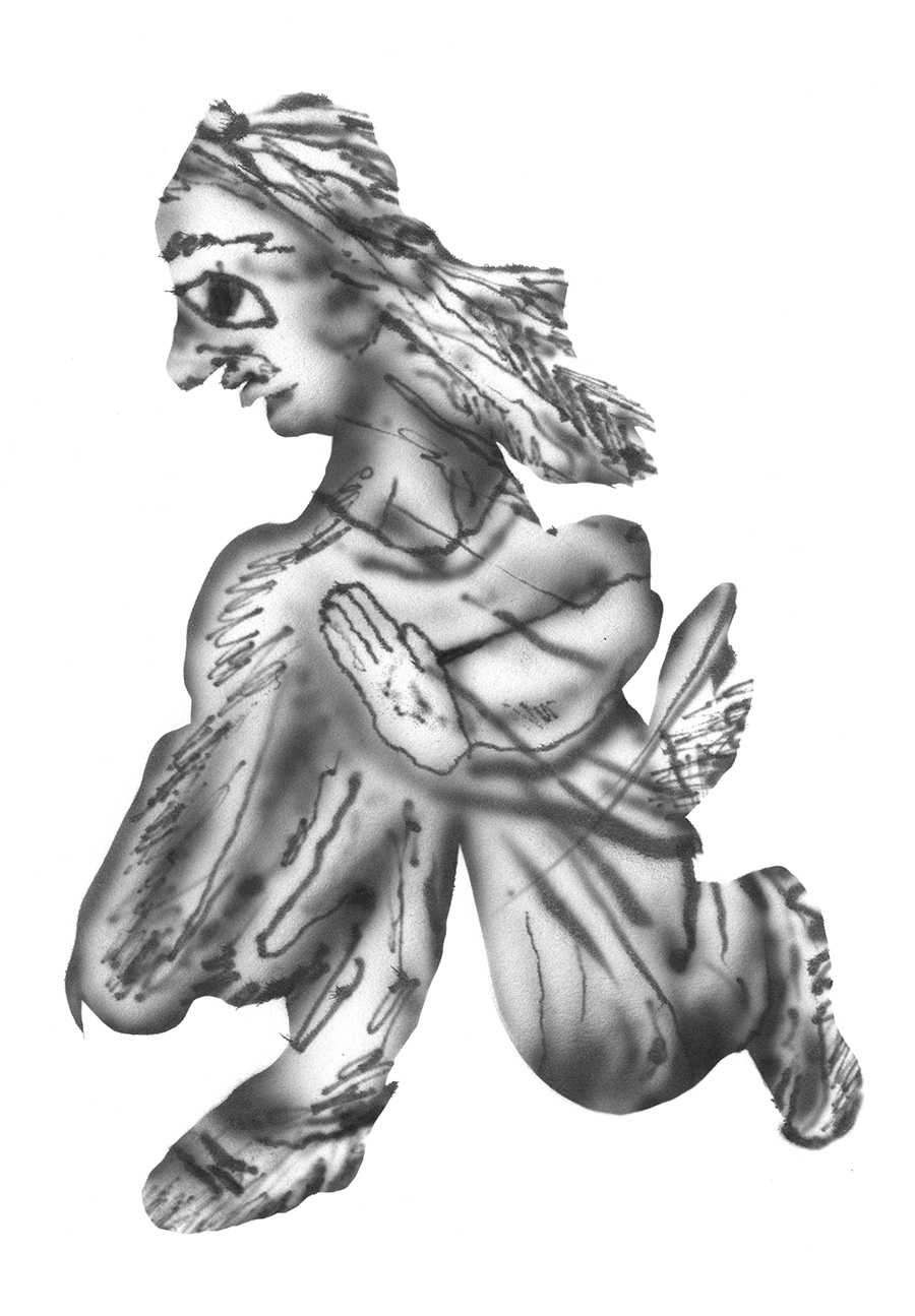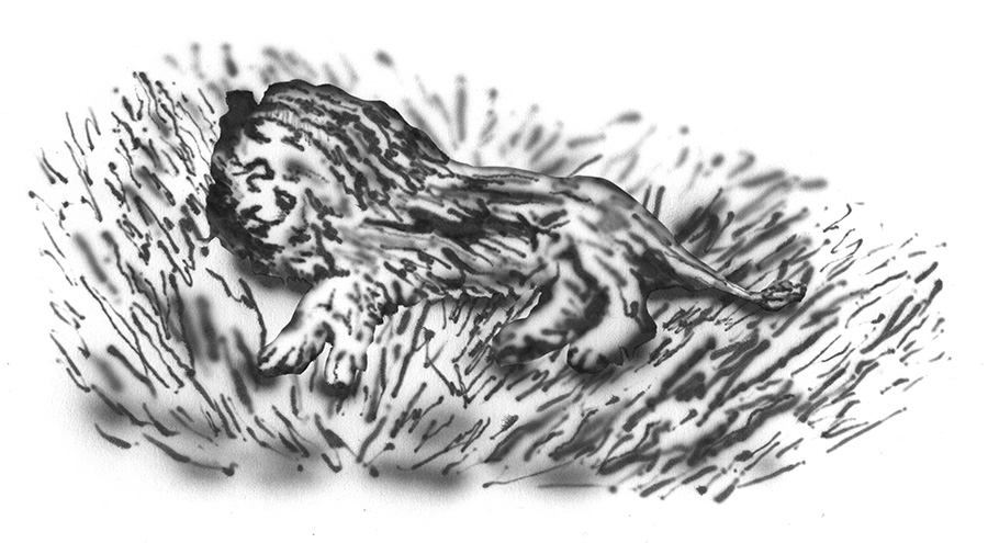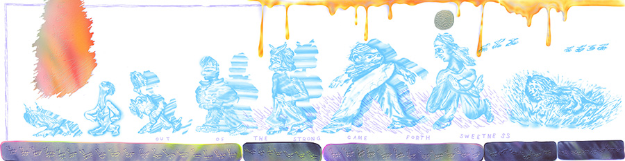 this is an airbrush comic made for a risograph anthology, An Unknown Power in 2019. a procession of figures passes the lion infamously ripped open by Samson's hands, its corpse then adopted by bees as a hive. Samson passed by the lion hive a second time, and took the honey to serve to guests later that evening, presenting it to them with a riddle. This image was used as a logo for Lyle's Golden Syrup in the UK, with the fragment of Samson's riddle : out of the strong came forth sweetness